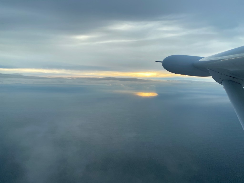 Back to the flight and a last bit of sun reflecting off the water before heading above the clouds.