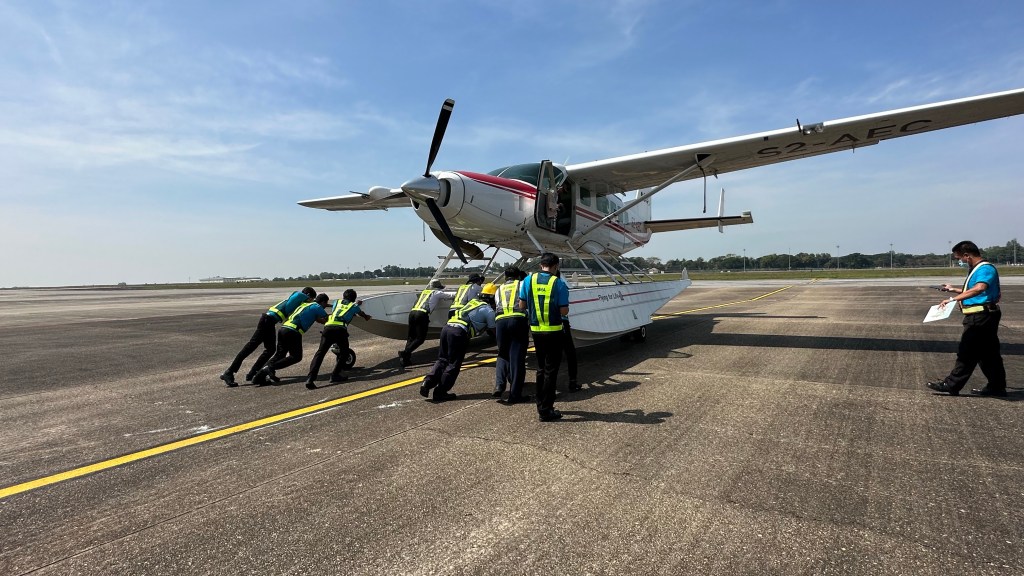 We weren’t allowed to turn the aircraft around on the tarmac so the airport staff pushed the plane into place.